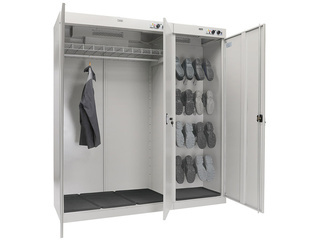 • шкаф состоит из двух независимых секций. Первая двухдверная для одежды, с перекладиной для вешалок и полкой. Вторая - для сушки обуви, оборудована патрубками для её развешивания